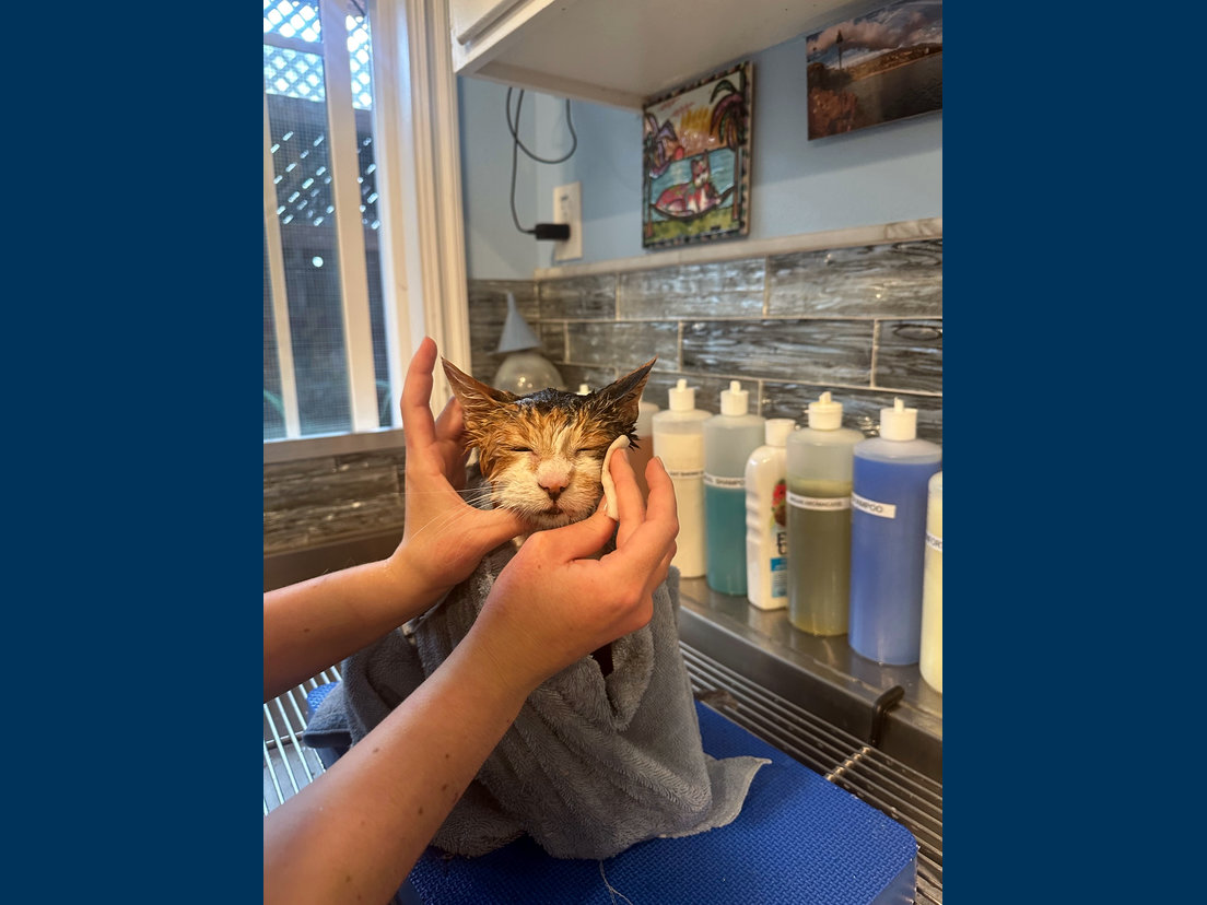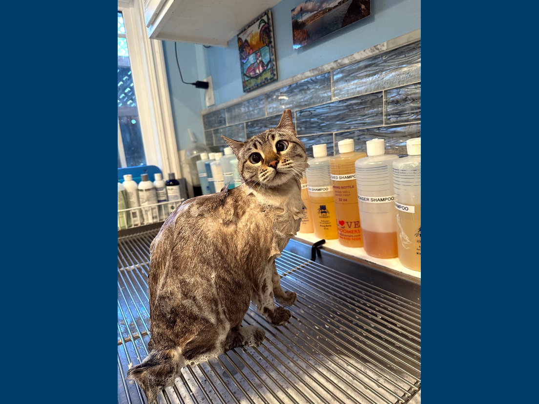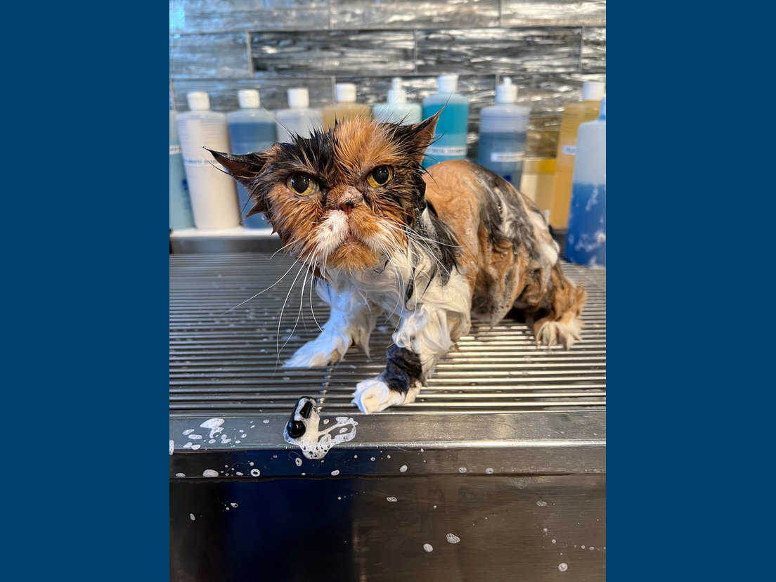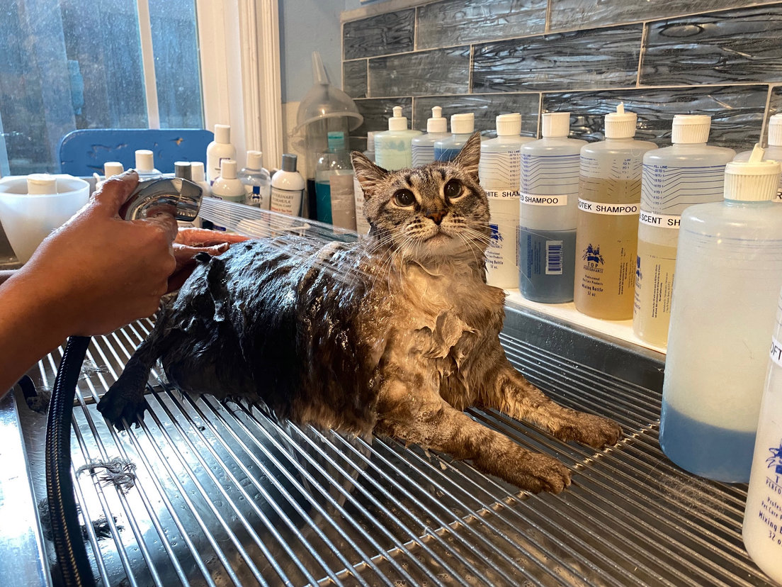 2 shampoo's, Ear clean, Nail trim, Brush out, and blow out.